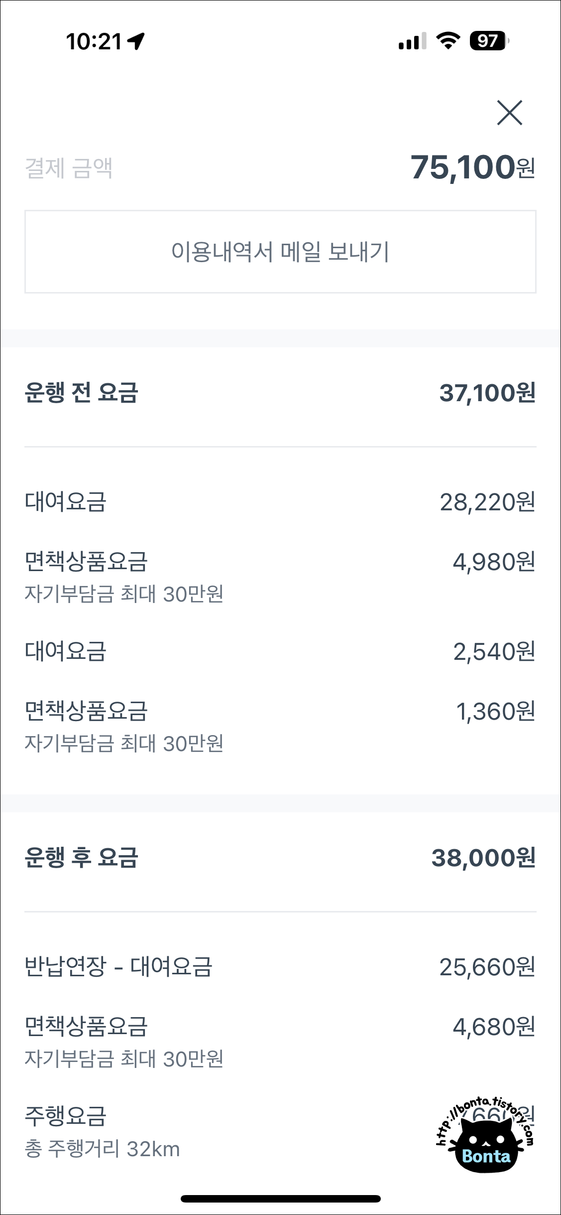 4시간 20분, 총 32km를 사용하고 75,100원.