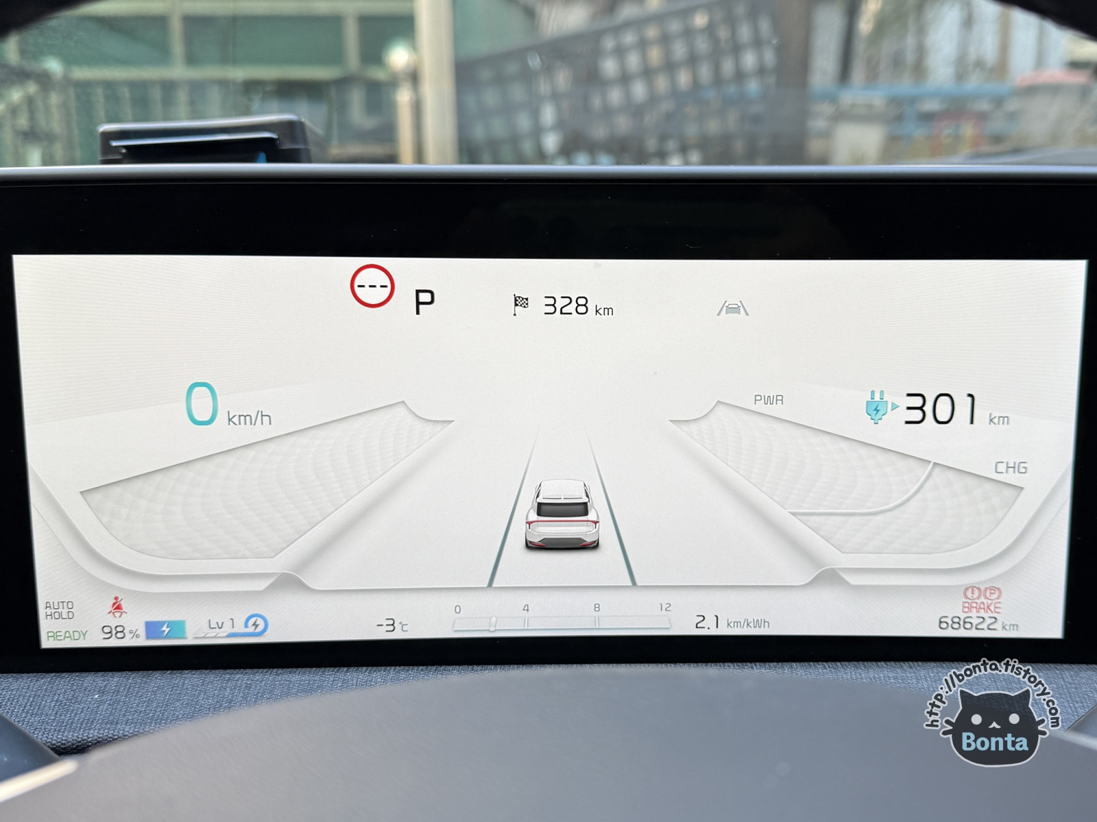 배터리 충전률 98% 상태에서 차량을 받았는데 주행가능 거리는 고작 301km.