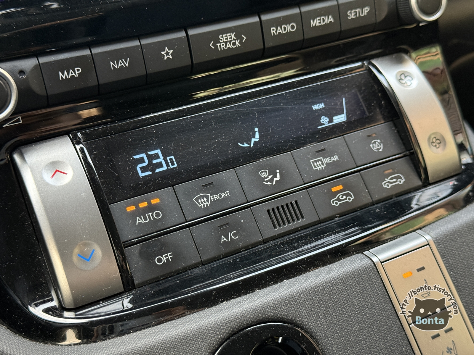 공조기 영역 역시 꽤 커다란 디스플레이에 세련된 버튼들이 위치하고 있다.