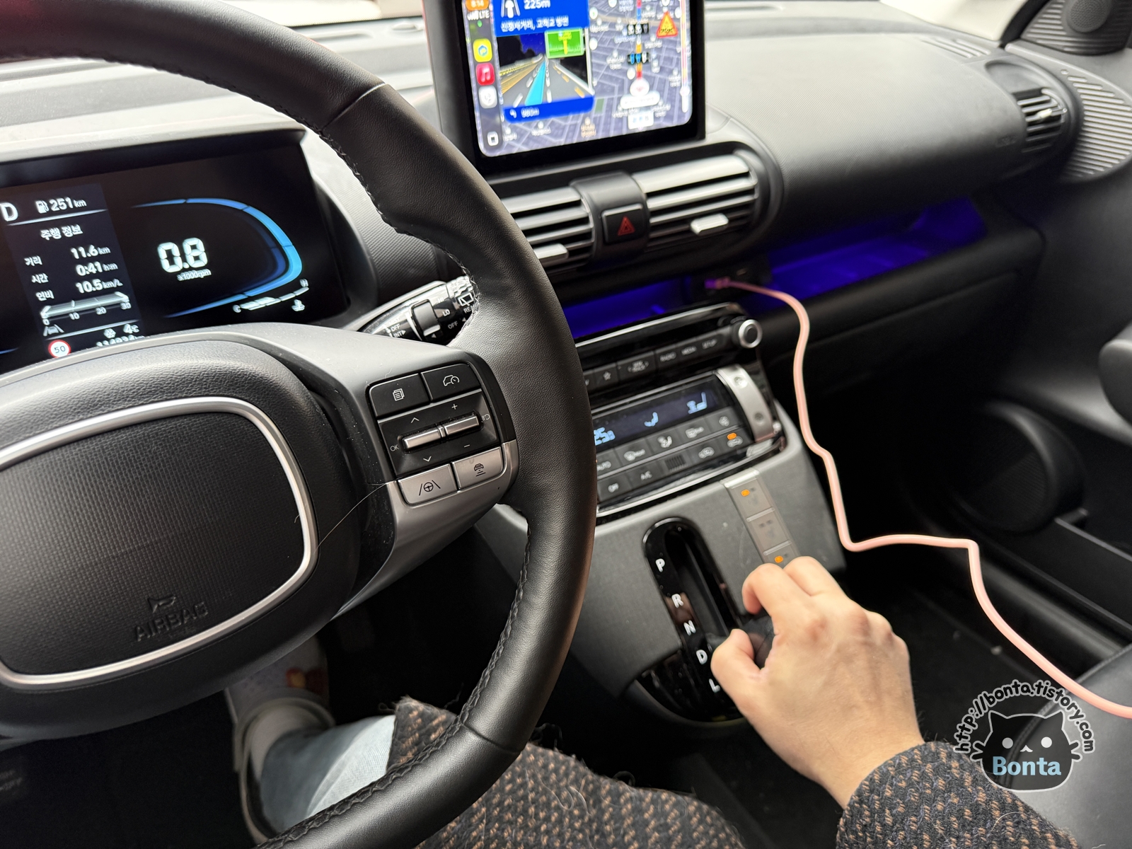 콘솔박스 앞쪽에 기어봉이 위치한 여느 소형차와 비슷한 느낌으로 팔을 걸치고 있을 수 있다.