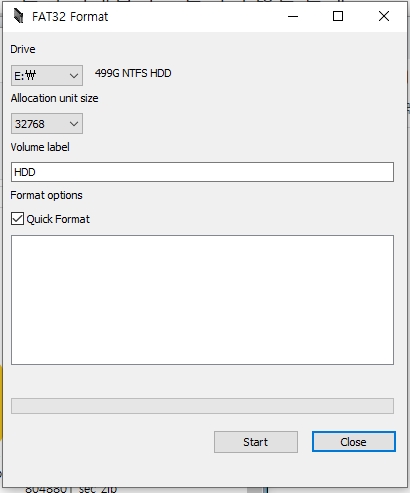 FAT32로 포맷을 원하는 드라이브를 지정한 뒤, 'START' 버튼을 누르면 끝.