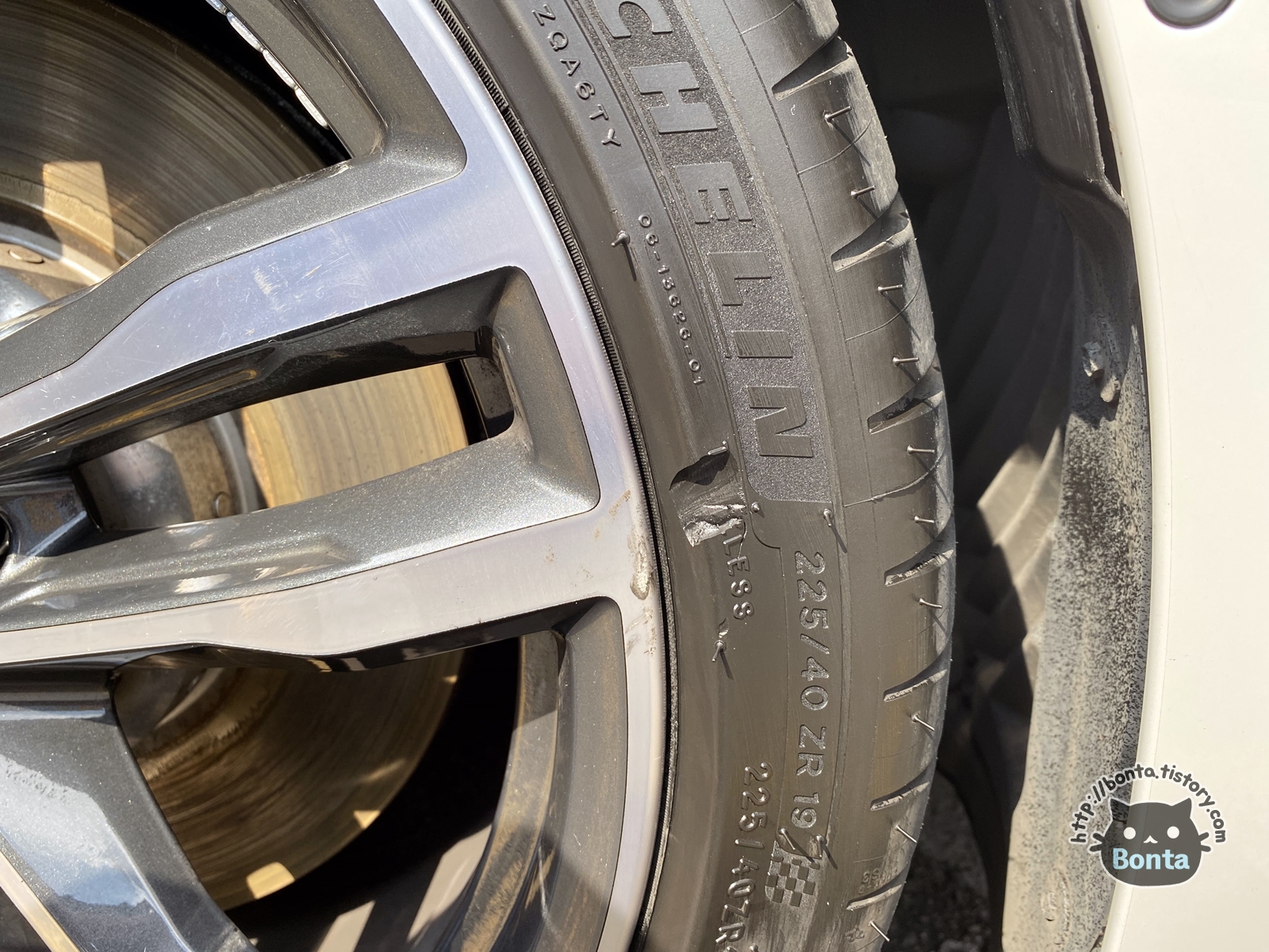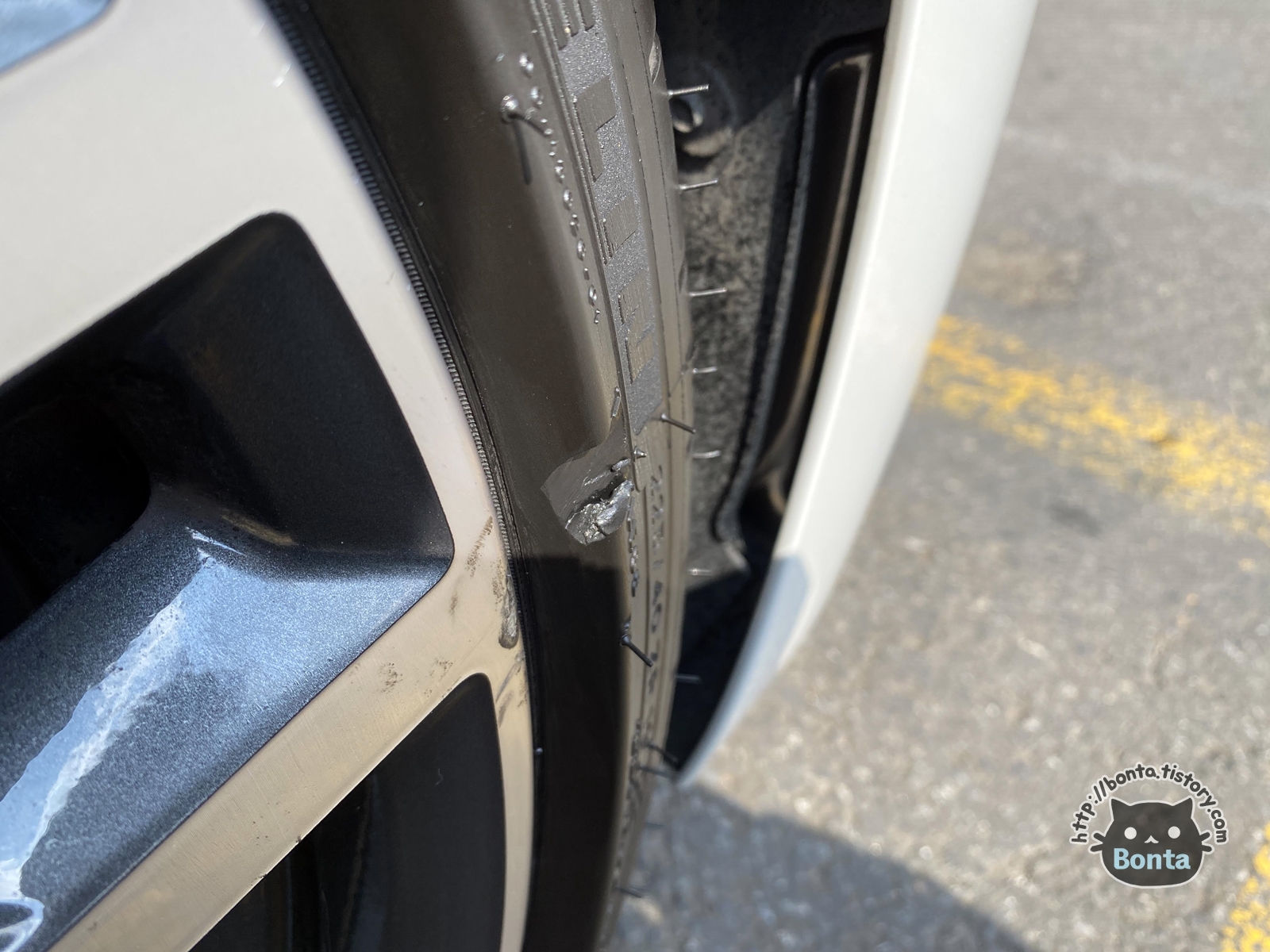 세차를 하다 보니 타이어 측면에 손상이 가 있었다.