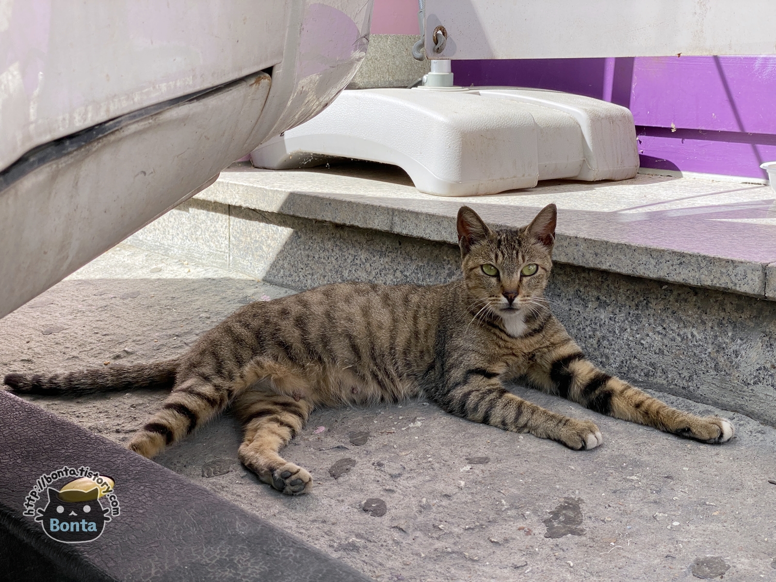 묘하게 사람을 잘 따른다 했더니 가게 앞에 물그릇이 눈에 들어왔다.