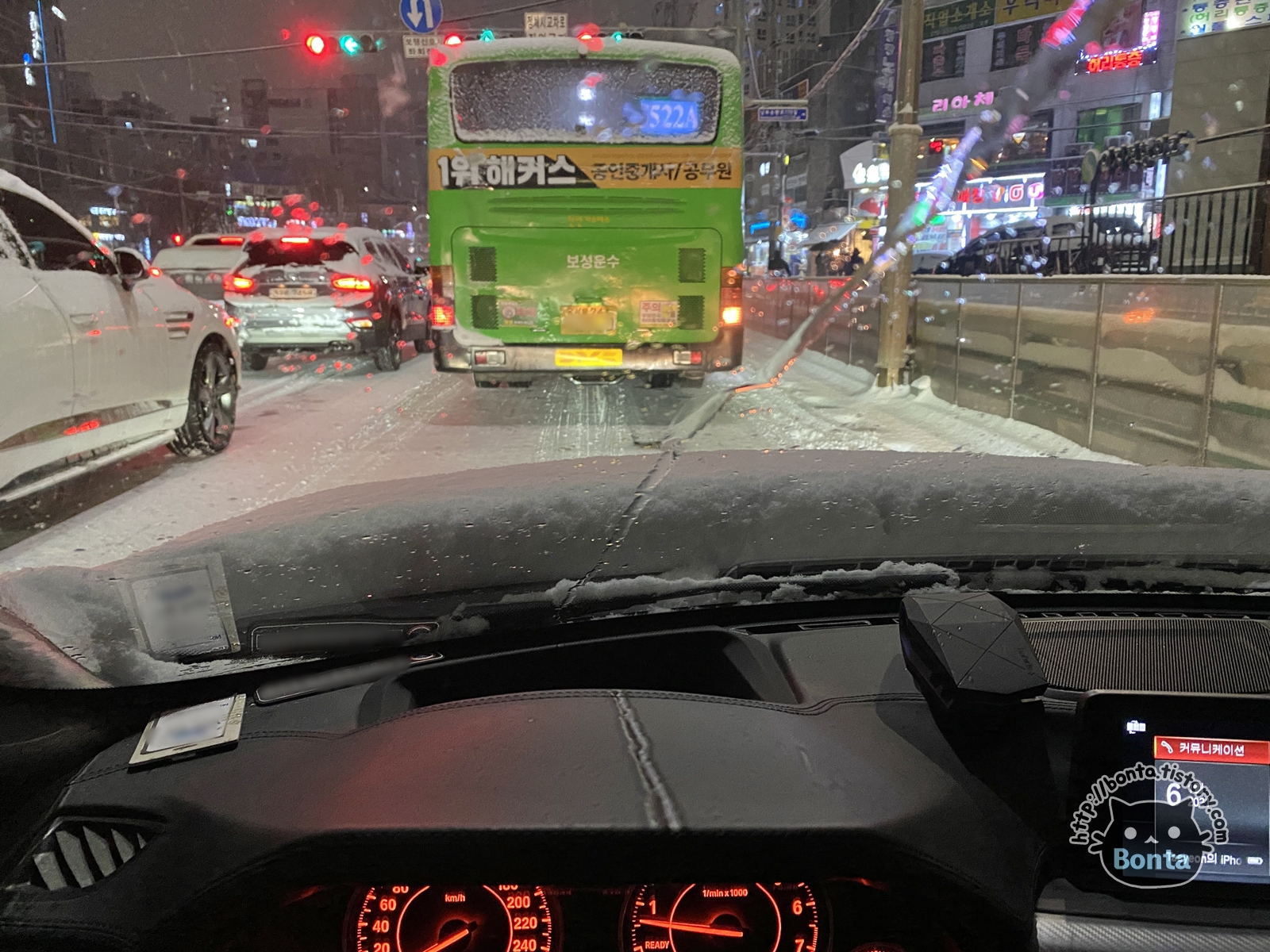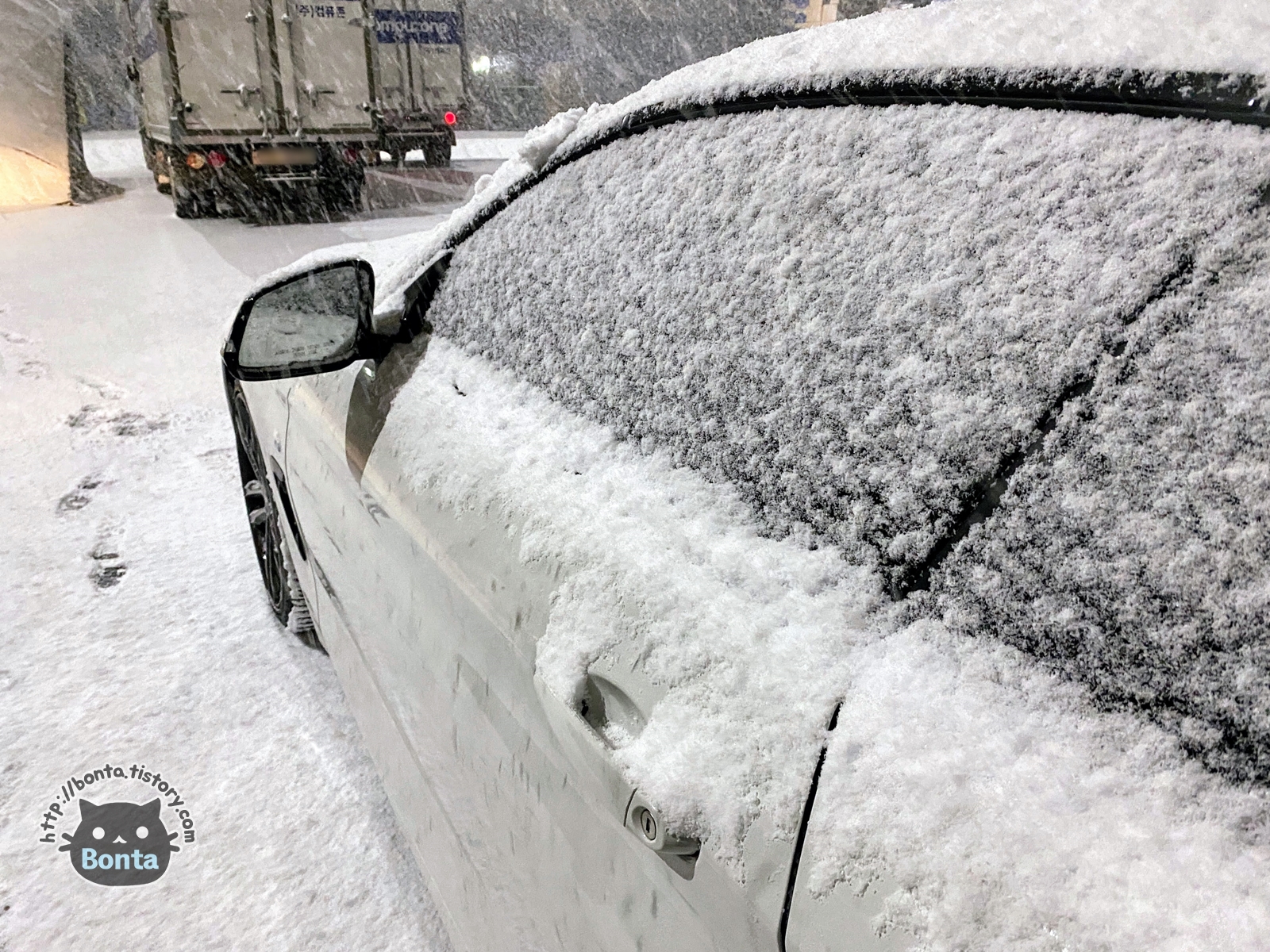 블랙박스에 사용할 젠더를 찾기 위해 2분 남짓 자리를 비운 사이에 차에 쌓인 눈.