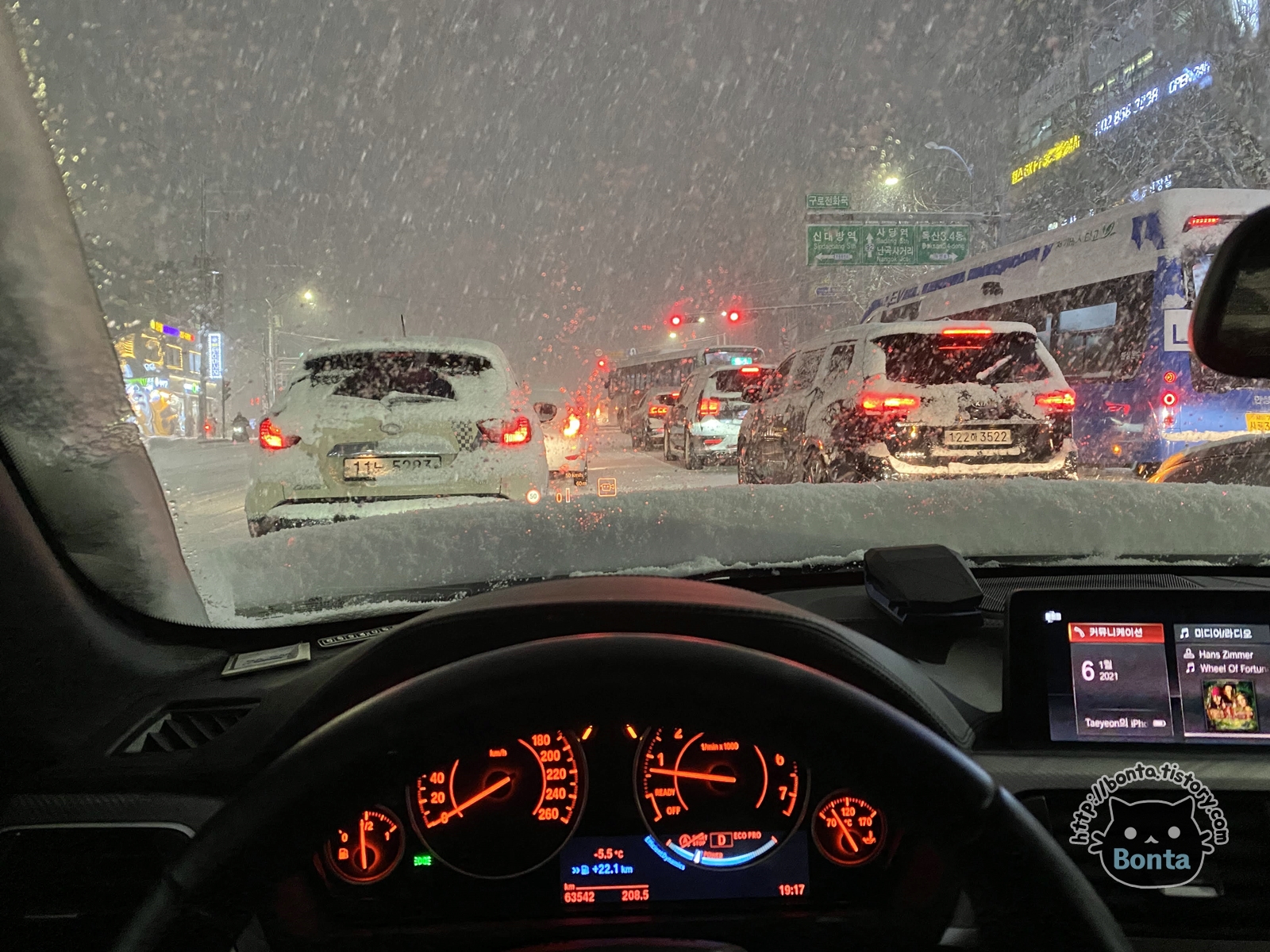 눈 때문에 길이 막혀 차가 움직이지도 못하는 상황에서