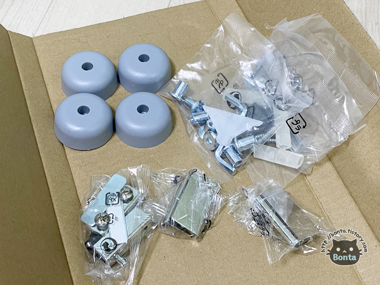 장식장 조립에 필요한 작은 부품들은 상자에 모아져 있는데