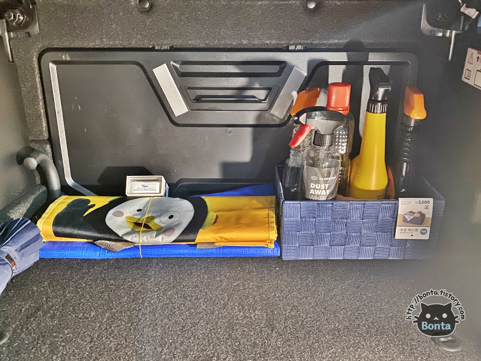 그간 트렁크에서 여기저기 굴러다니던 유리세정제까지 쏙 들어가고도 공간이 남는다.