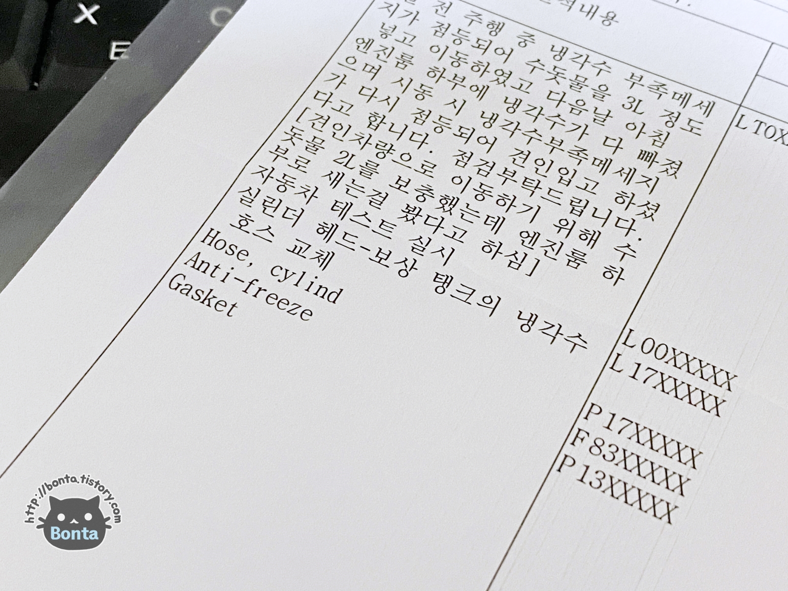 교환한 부품은 호스 실린드, 냉각수, 가스켓의 3종인 모양.