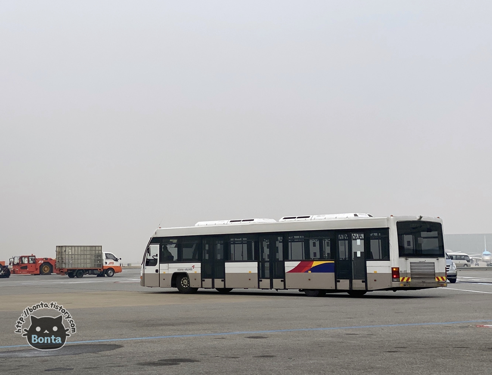 버스를 타고 활주로 중앙까지 나가야 했다.
