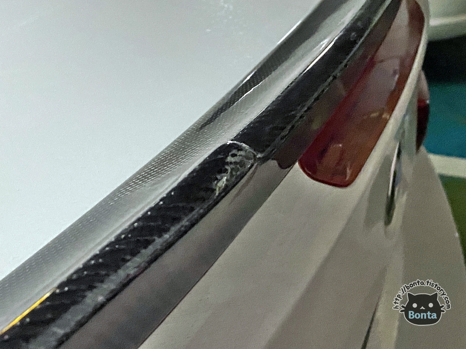 트렁크가 주차장 벽 쪽으로 향하며 스포일러가 벽에 닿은 것.