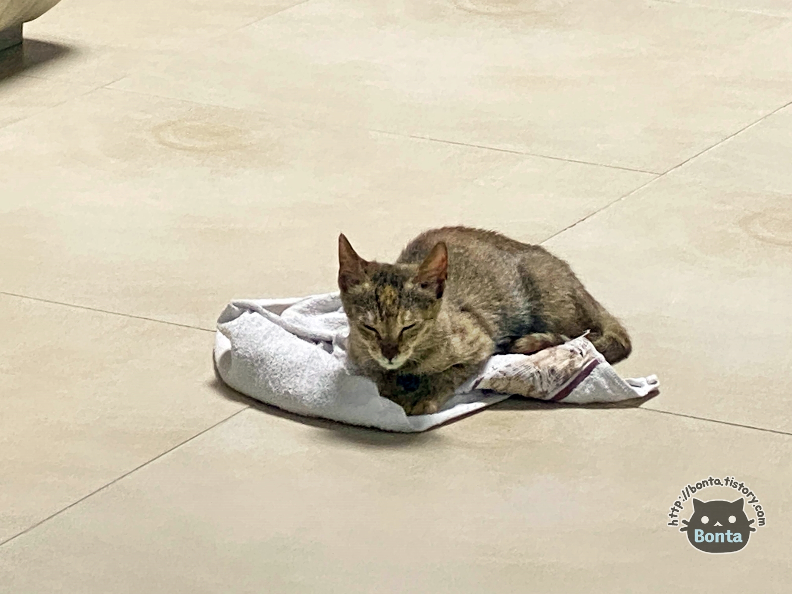 물품들을 정리하는 동안 바닥에 깔아뒀던 수건 위에서 잠을 청한다.