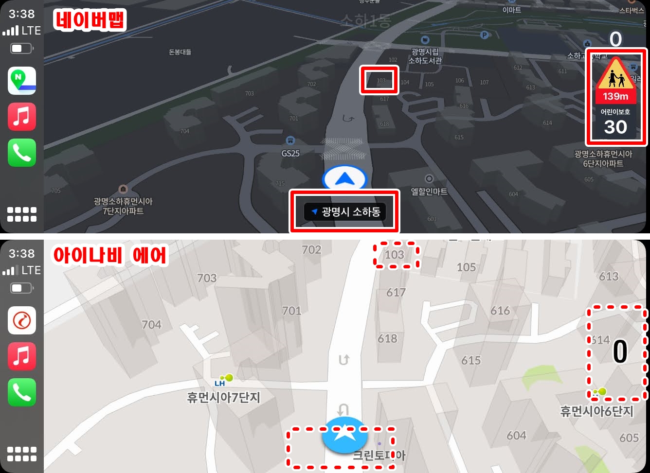 이미지 기준, 상단은 네이버맵, 하단은 아이나비 에어인데...