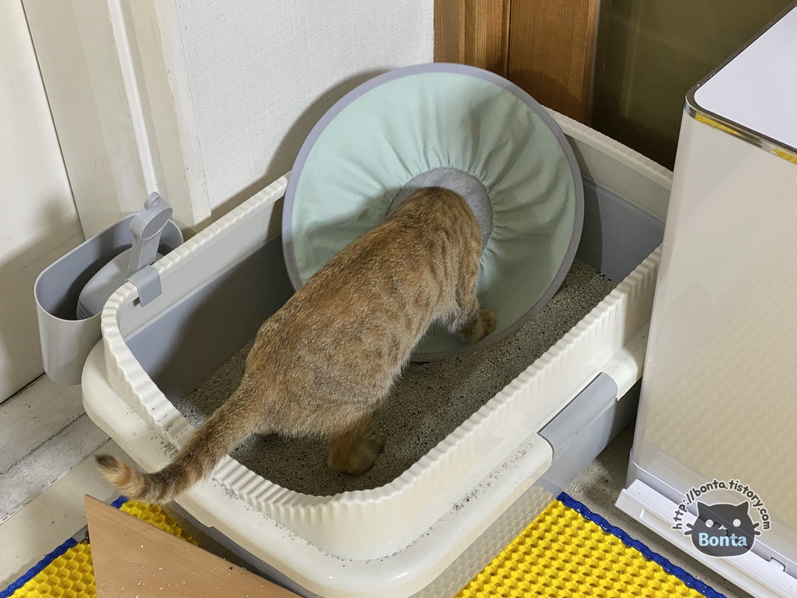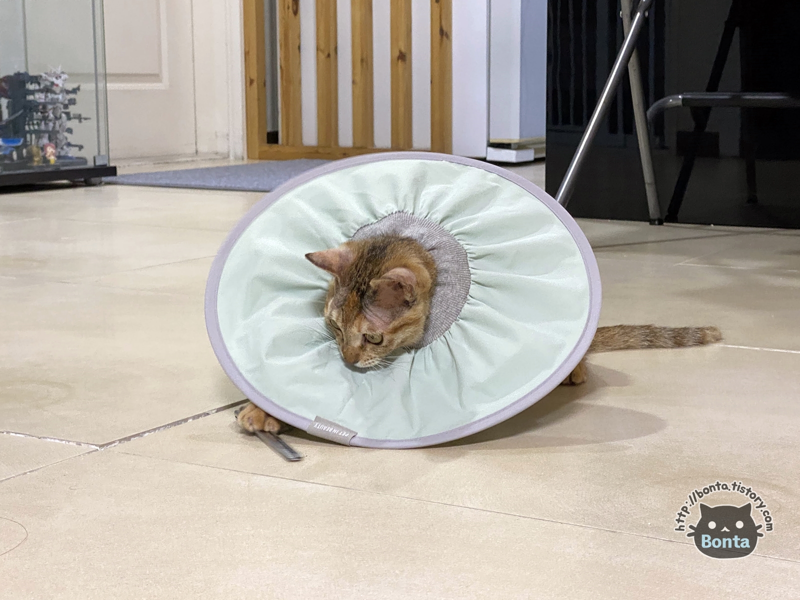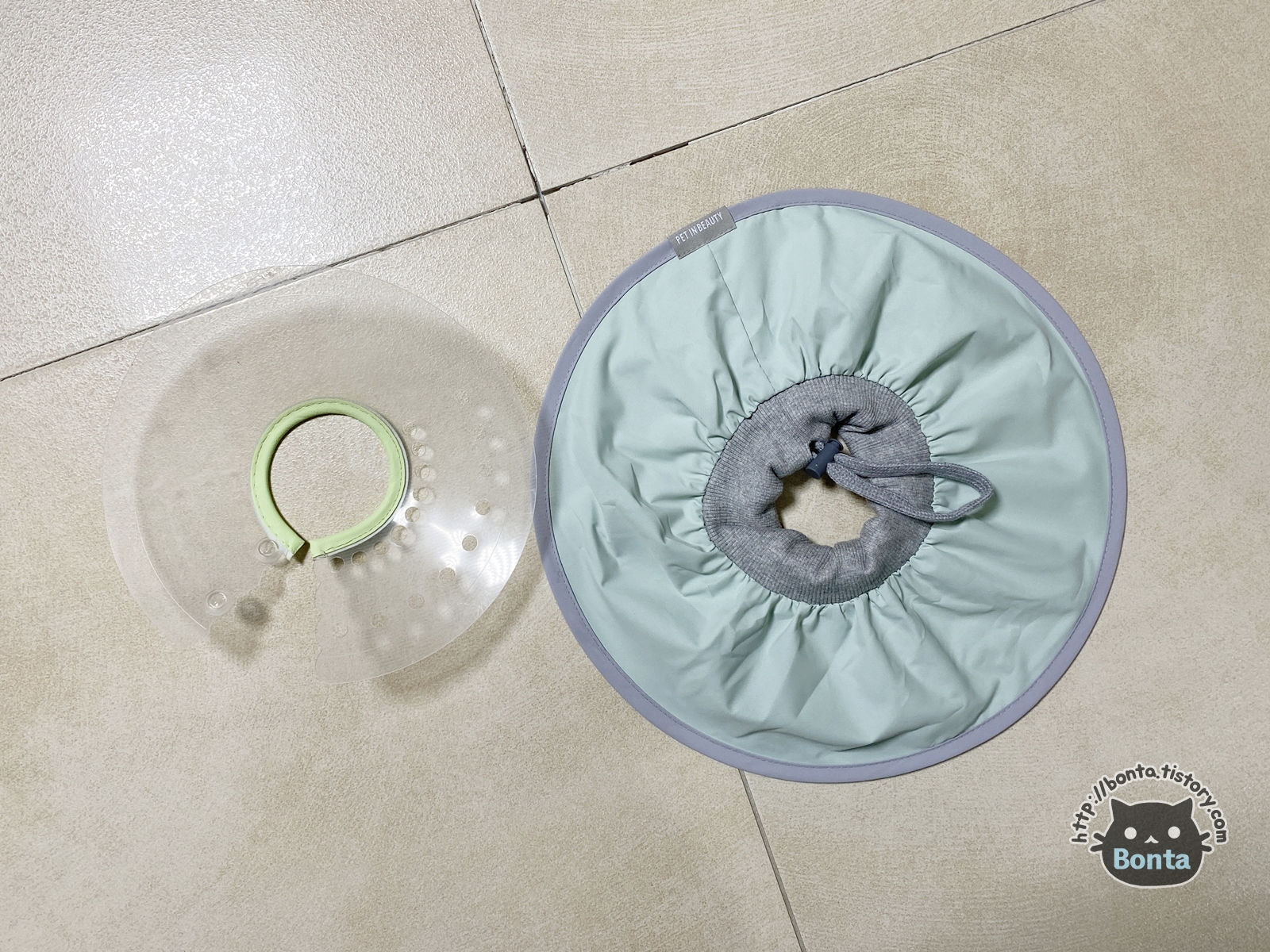 링웜 진료 이후, 병원에서 구입한 플라스틱 넥카라. https://bonta.tistory.com/825 워낙 불편해 해서 가위로 테두리를 살짝 잘랐다가, 바로 뒷발로 귀를 긁는 바람에 다음 날 새걸 구매해주기도 했다. 10/