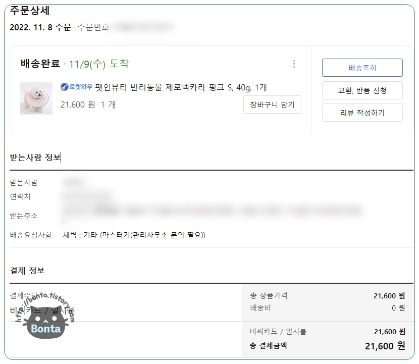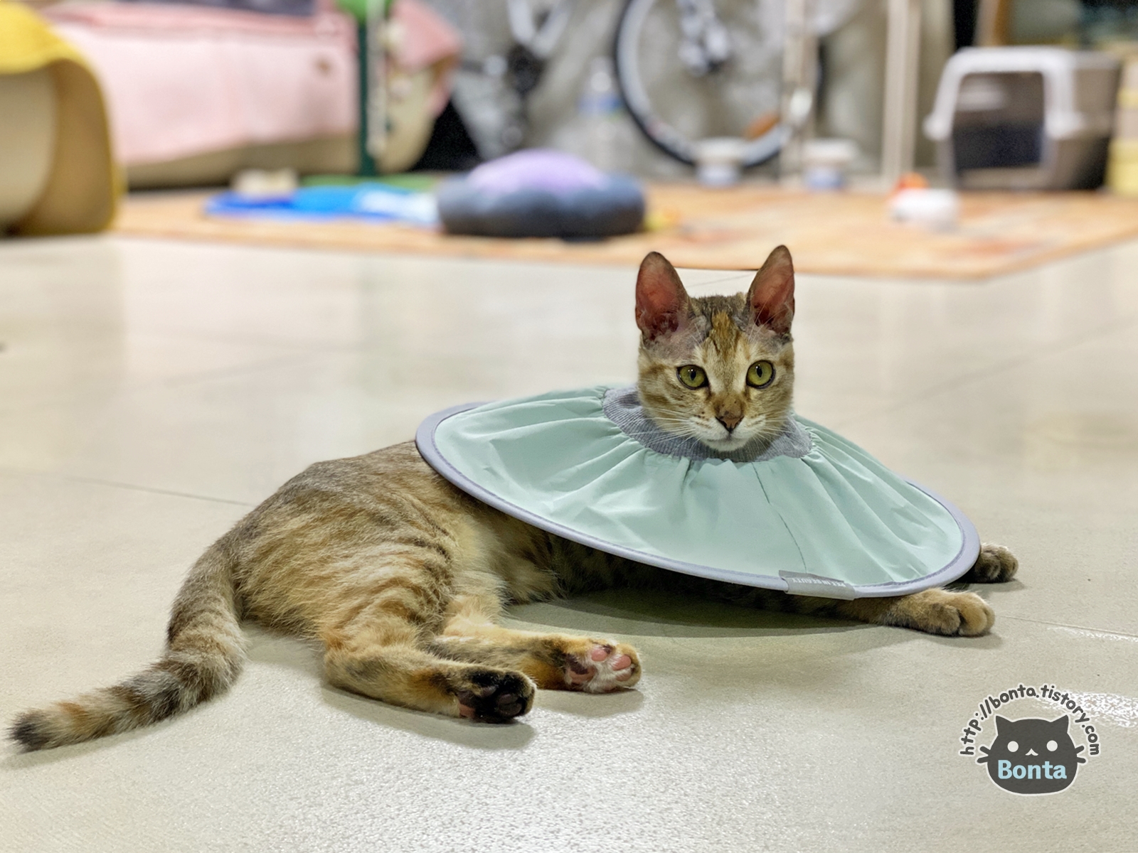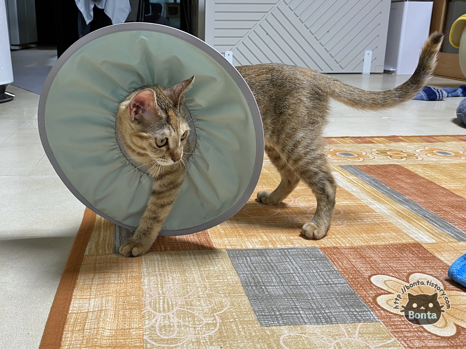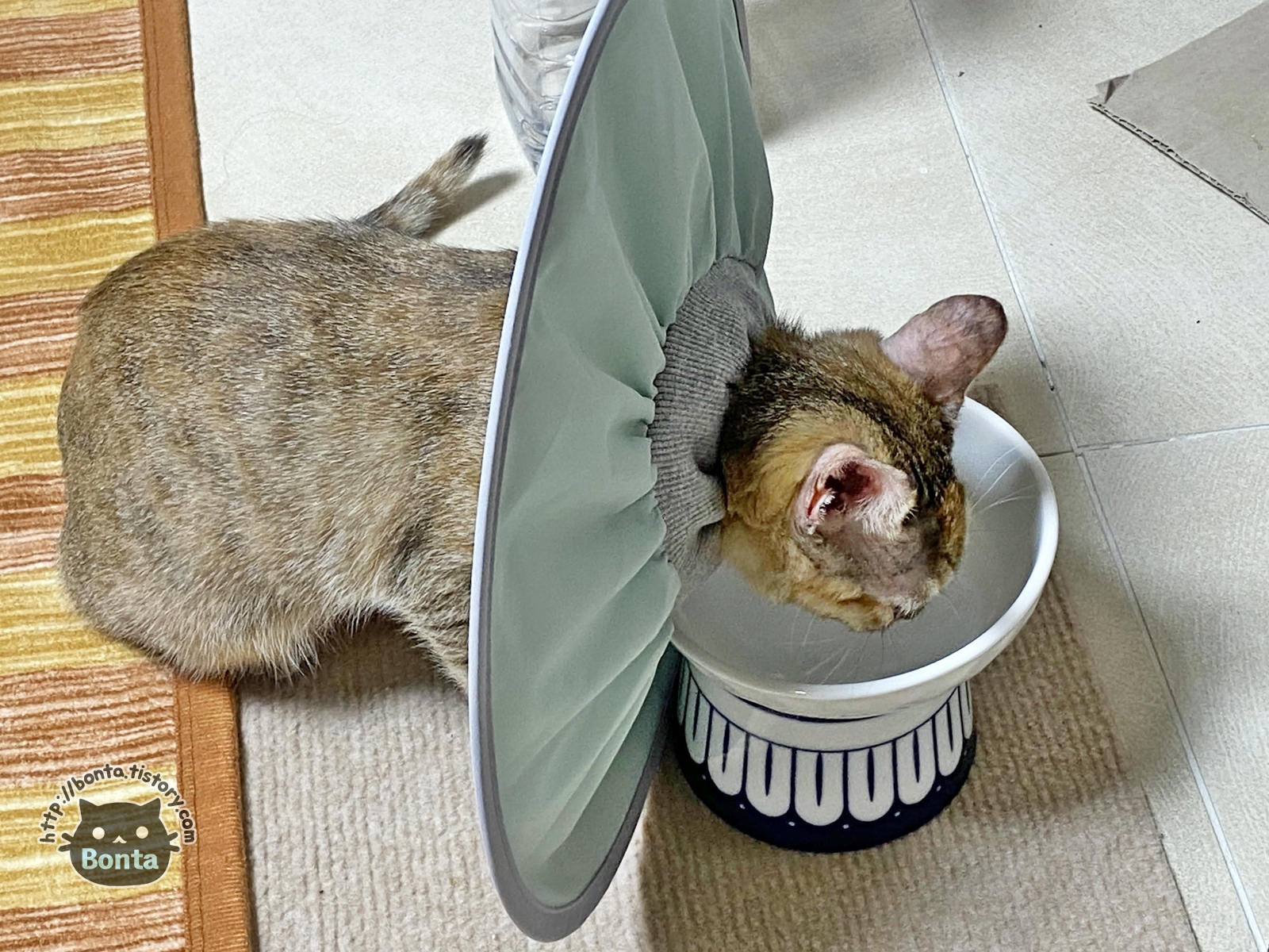 링웜 진료 이후, 병원에서 구입한 플라스틱 넥카라. https://bonta.tistory.com/825 워낙 불편해 해서 가위로 테두리를 살짝 잘랐다가, 바로 뒷발로 귀를 긁는 바람에 다음 날 새걸 구매해주기도 했다. 10/