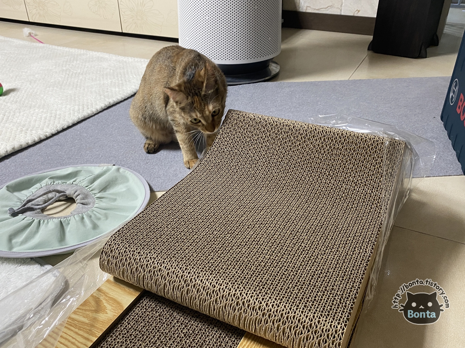 호댕이를 데려온 뒤로 맞는 '내' 첫 생일. 그런데 무슨 일인지... 내 생일임에도 선물을 고양이 선물이 들어온다. 그렇게 선물로 받은 '펫톤 소파 스크래쳐 딥 그린'. 안그래도 스크래쳐를 하나 사