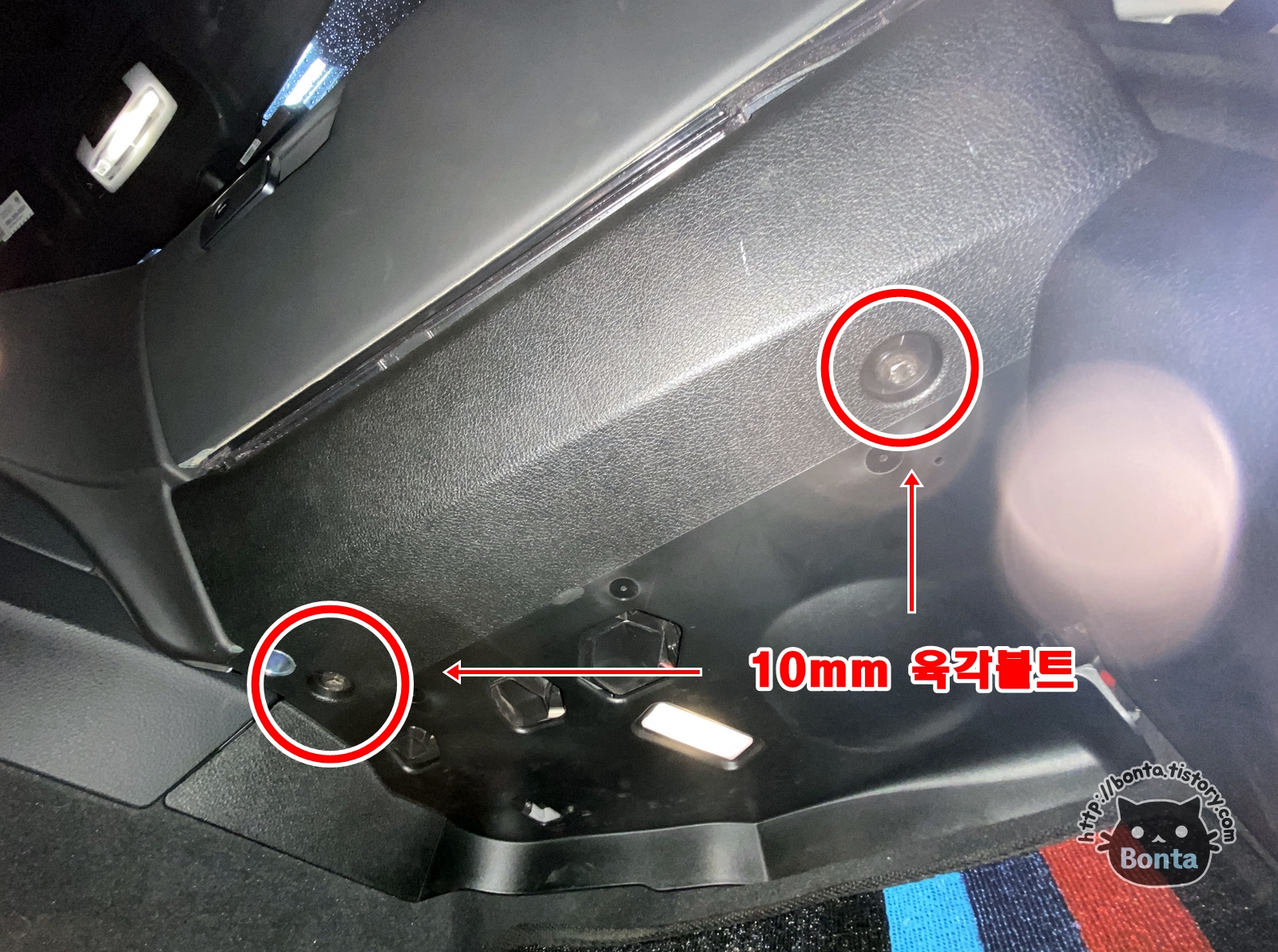 글로브 박스 하부를 보면 10mm 육각볼트 두개가 보인다.