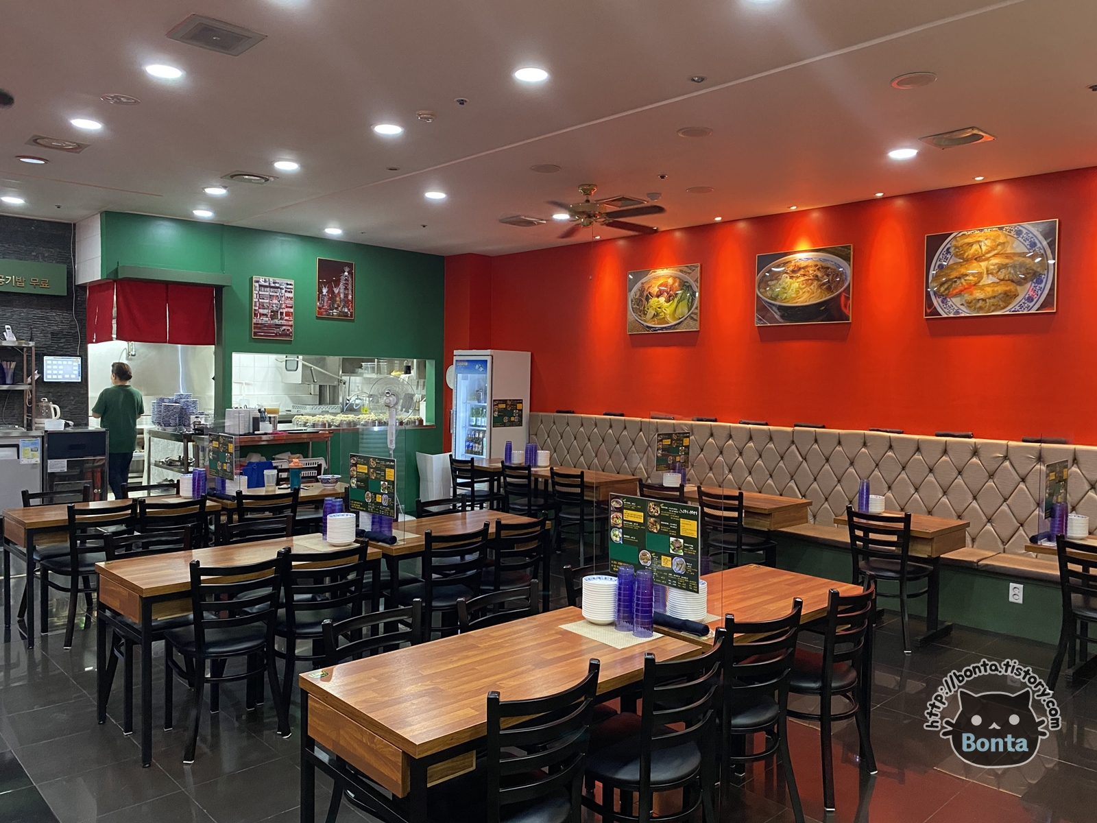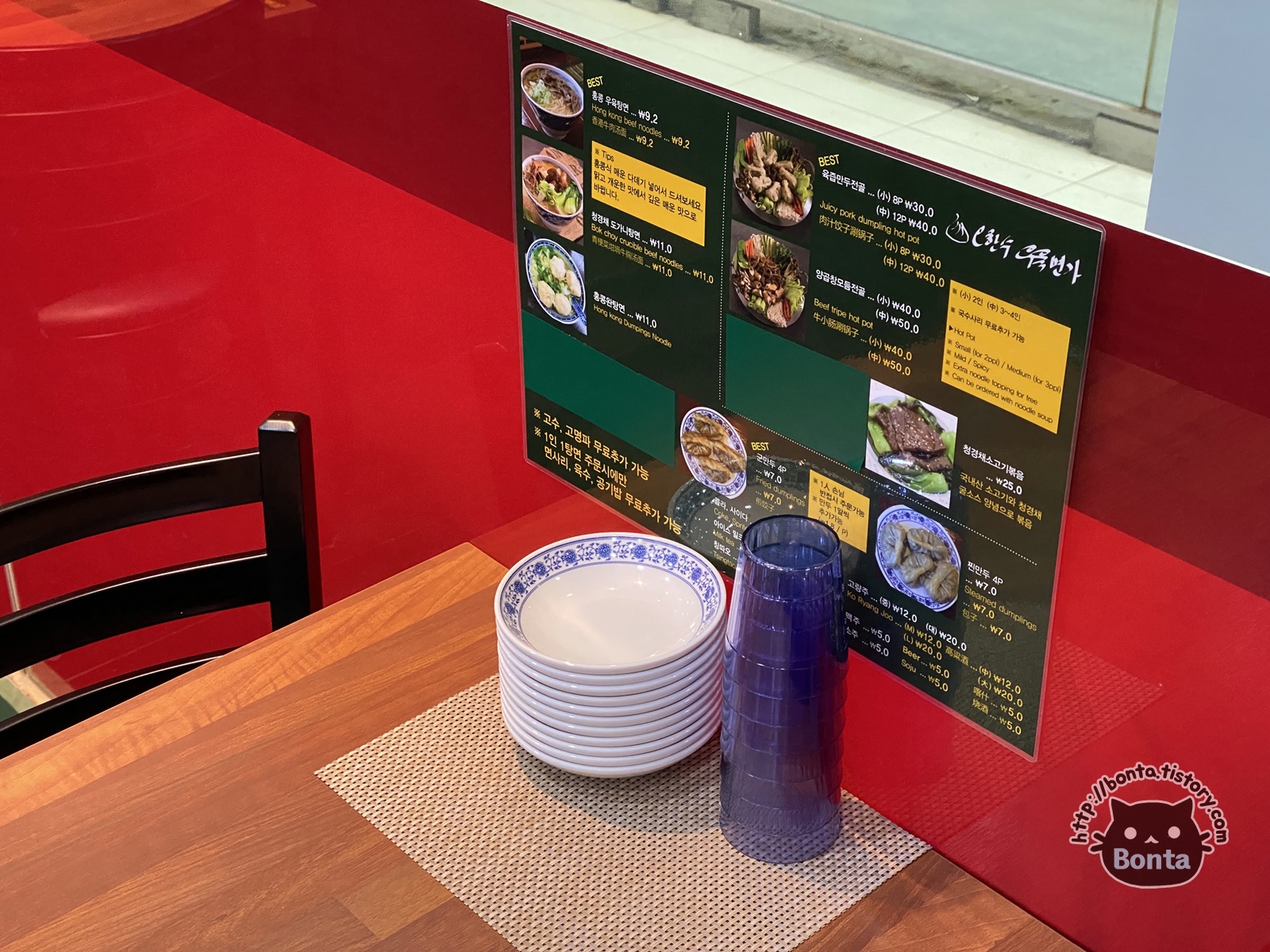 짙은 초록과 짙은 빨강으로 인테리어를 한 오한수 우육면가.