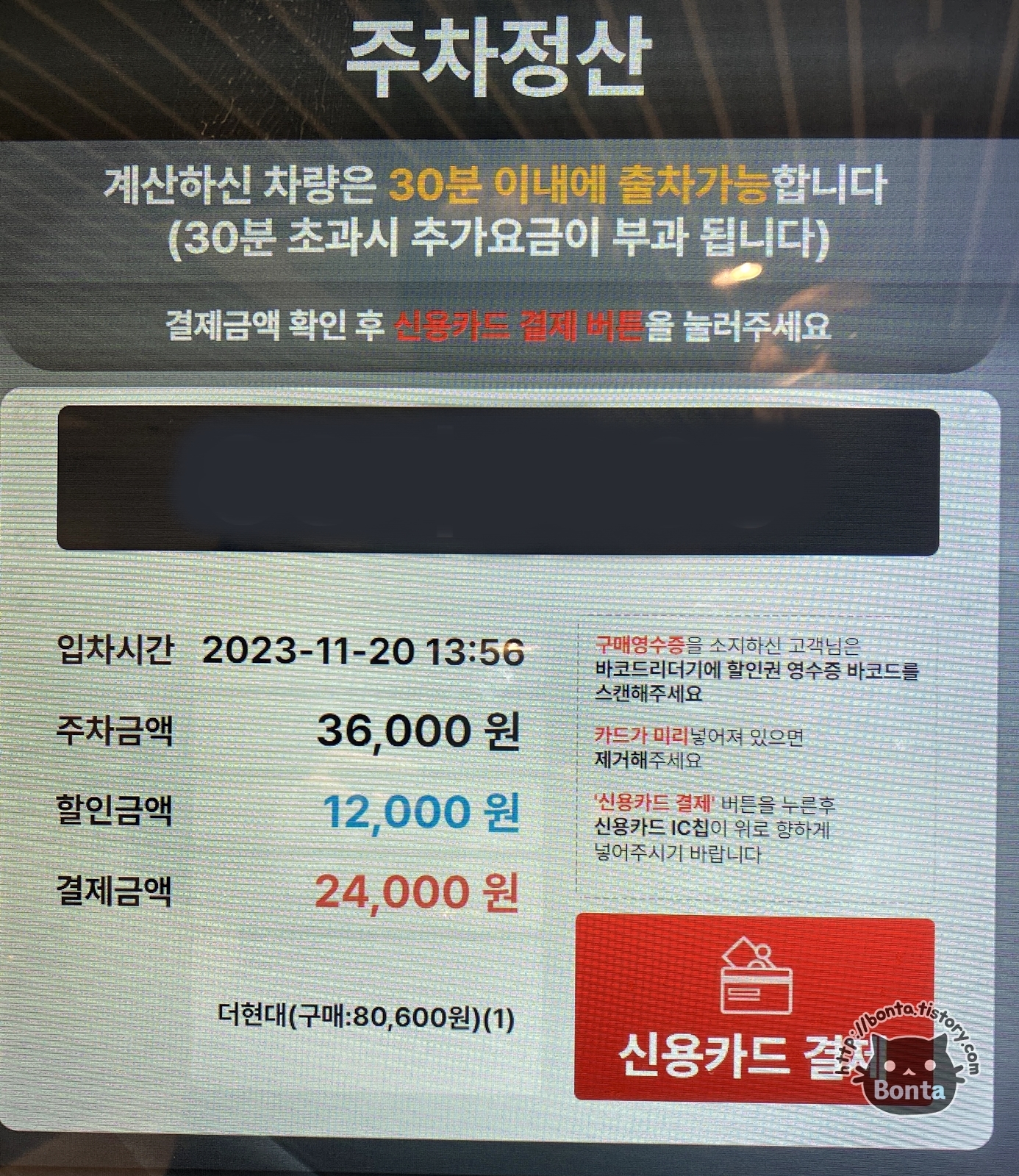 본인은 더현대에 3시간20분 정도 머물러서 총요금 36,000원이 나왔다.